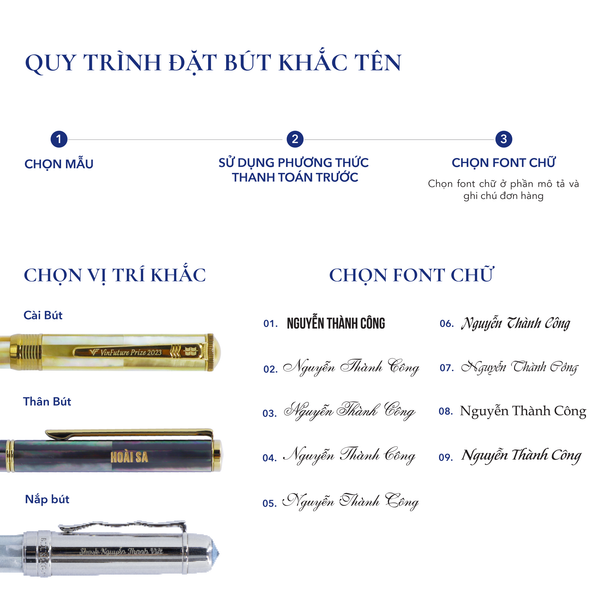 Font chữ cũng là yếu tố quan trọng giúp chiếc bút ký khắc tên của bạn trông thẩm mỹ hơn. Theo đó, font chữ sẽ tùy thuộc vào sở thích, nhu cầu của mỗi người.